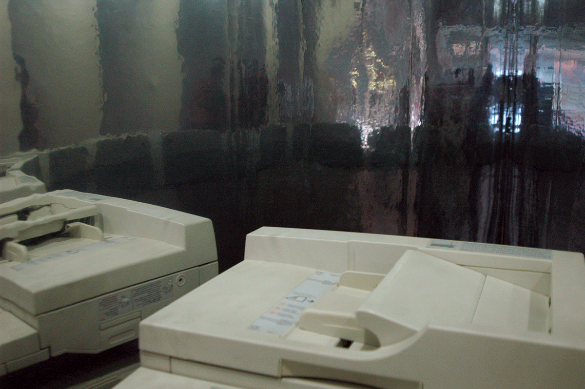 Installation detail of xerox machine infinitely reflected in the mirror wedge.
