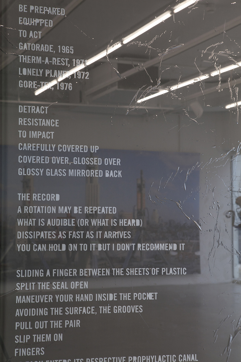 Installation view of the poem, Leave No Trace at Plug In Institute of Contemporary Art, Winnipeg, Canada. Made of laser cut window tint applied with wrinkles.