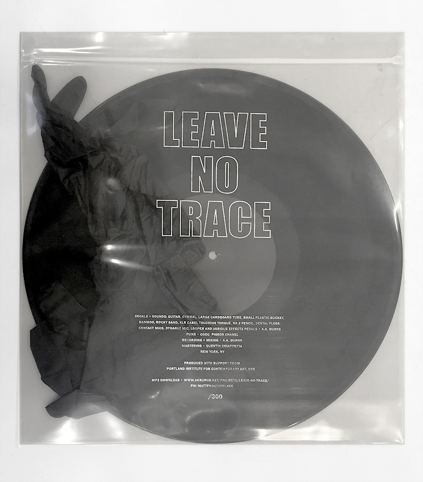 Leave No Trace, is an experimental audio project. The record has two tracks, one per side, consisting of improvisational recordings made with found materials and instruments. Referencing the common code of wilderness ethics known as “Leave No Trace,” the vinyl has blank labels with no orientation to side A or B, includes a pair of black nitrile gloves and is housed in a zip-lock bag silkscreened with the poem (printed on reverse).
