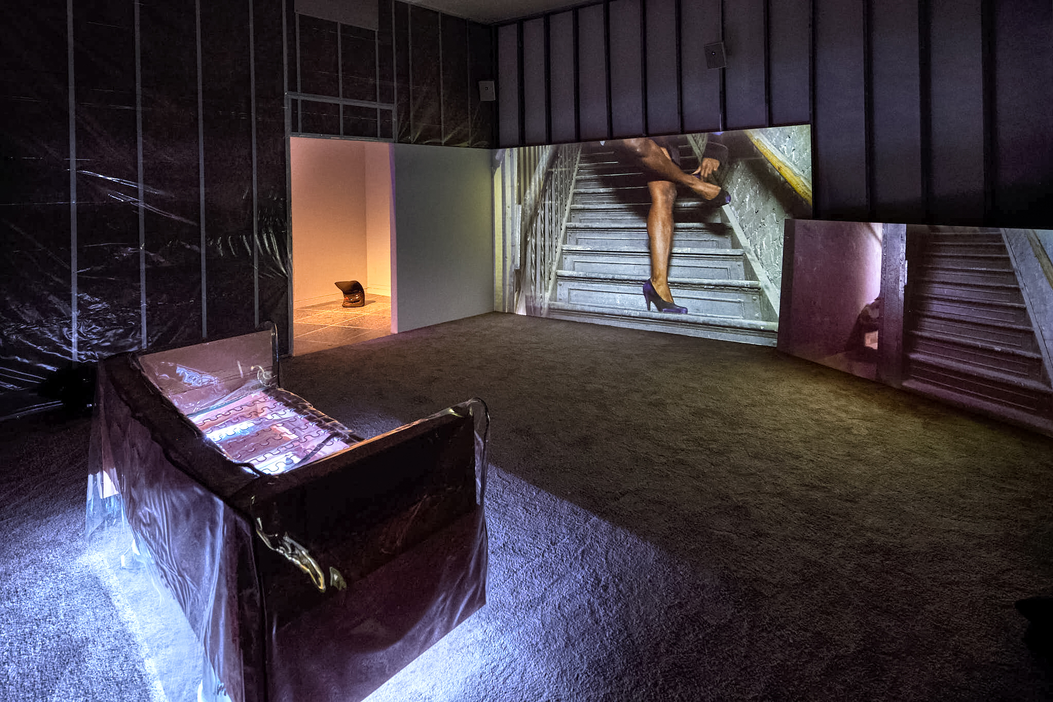 By exposing the substructure of the walls, the installation makes the site of the exhibition explicit as a constructed space and resembles a domestic space in the process of being deconstructed. The left channel of Living Room is projected onto a wall with partially exposed studs; the right channel is projected onto a propped piece of unused drywall. The floor is carpeted and a gutted couch wrapped in plastic protective covering is illuminated from below like a tricked-out car.