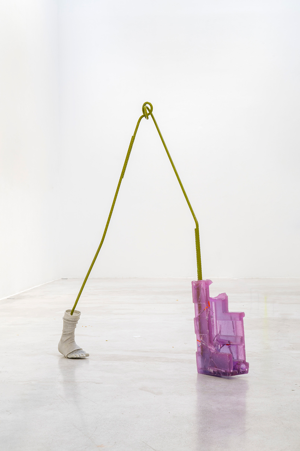 Adaptive Walker (medical waste), 2022, powder-coated steel rebar, concrete, sock, cast urethane resin, syringes, medical waste, 40 x 16 x 56 inches
