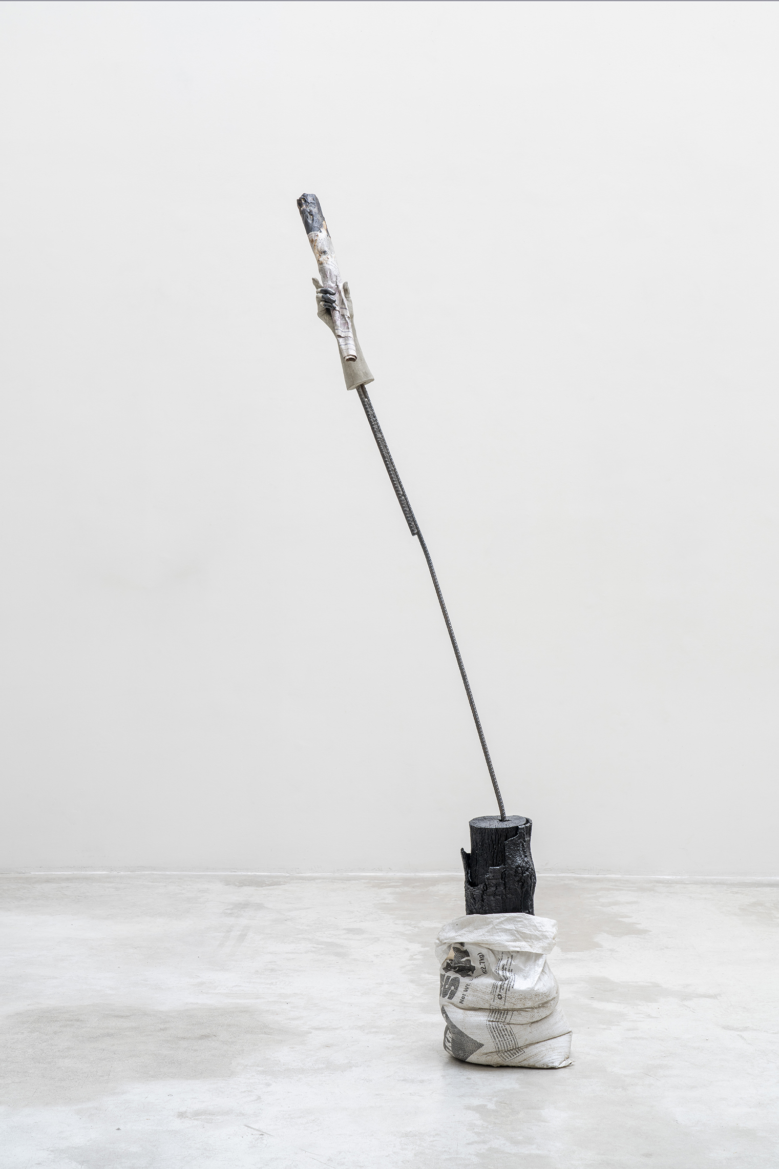 Marianne Deludes The World, 2020, aquaresin-concrete mix, newspaper, steel rebar, charcoal log, cast concrete bag, 84.25 x 41.34 x 11.81 inches