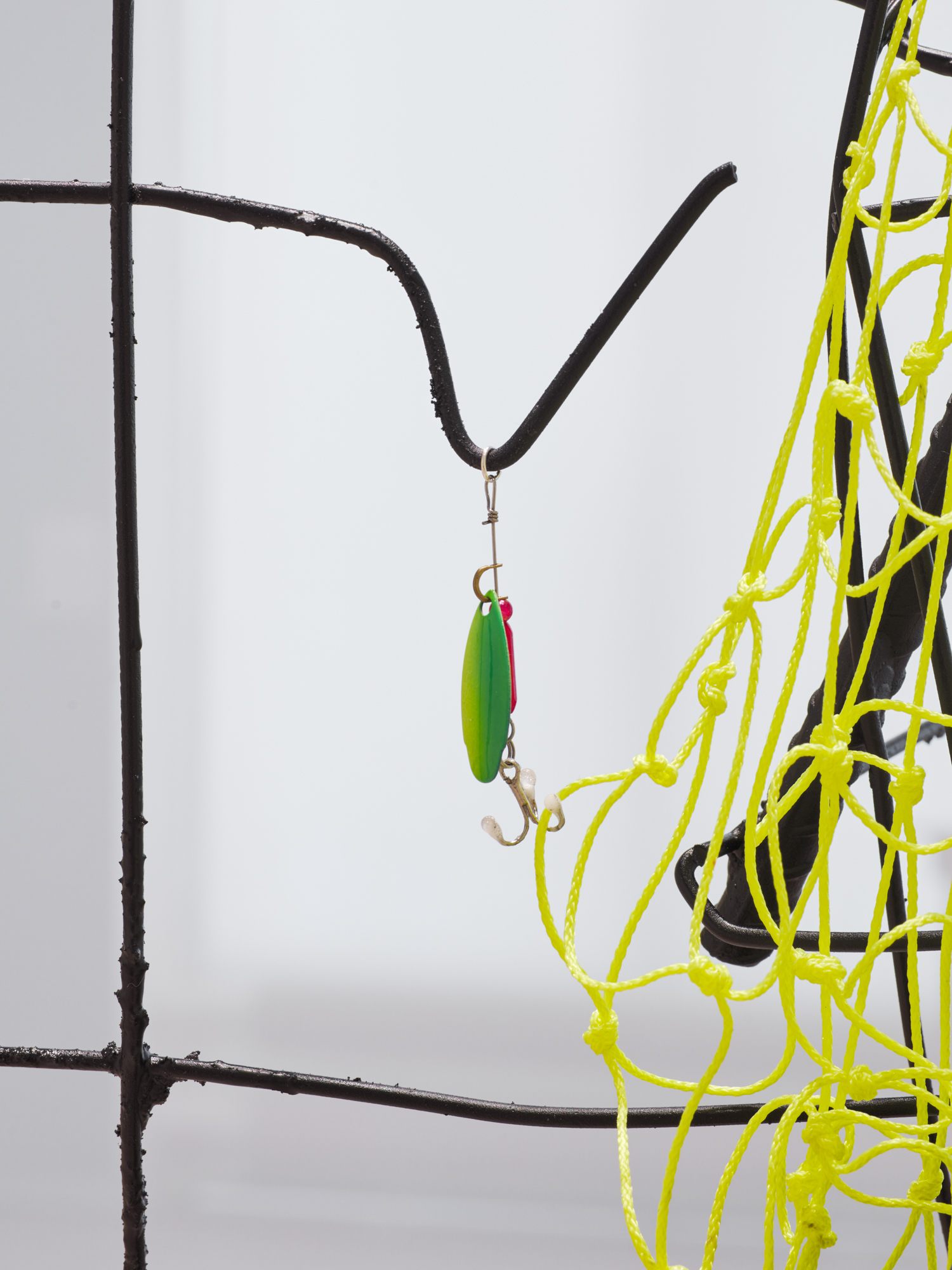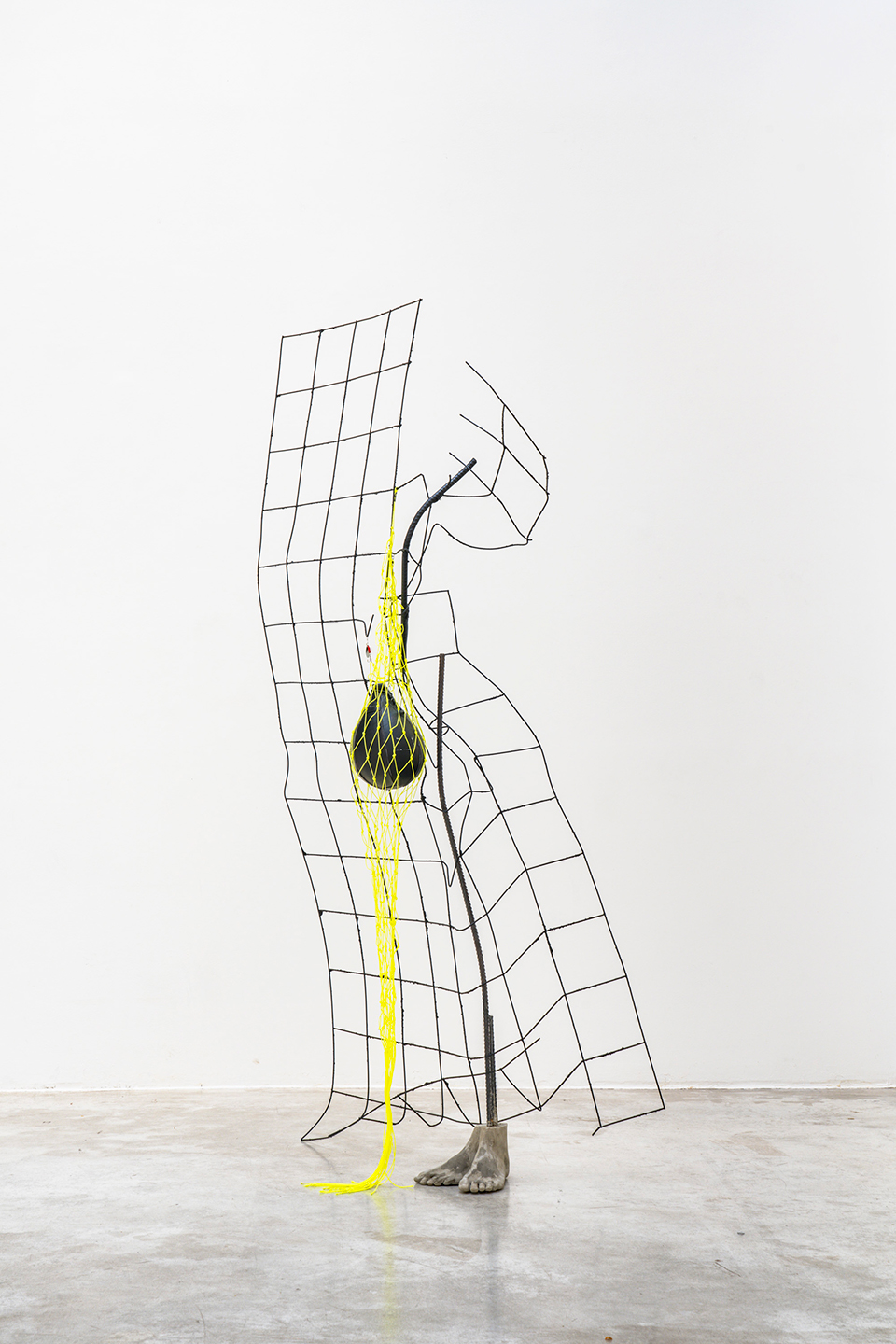 Night Shift, 2022, concrete, steel rebar and remesh, nylon cord, titanium lure leader, speed bag, powder coating, 81 x 40 x 21 inches