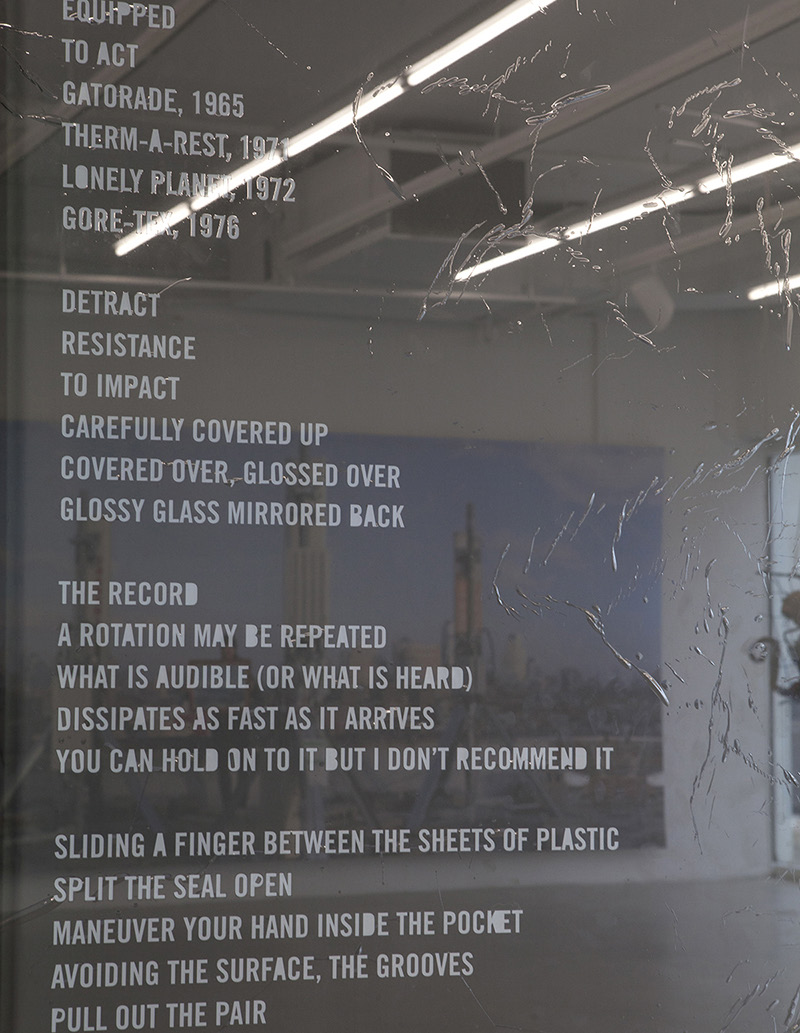 Detail Leave No Trace (poem), 2016-2023, laser cut window tint, dimensions variable, “Entering the Landscape,” Plug In Institute of Contemporary Art, Winnipeg, Canada